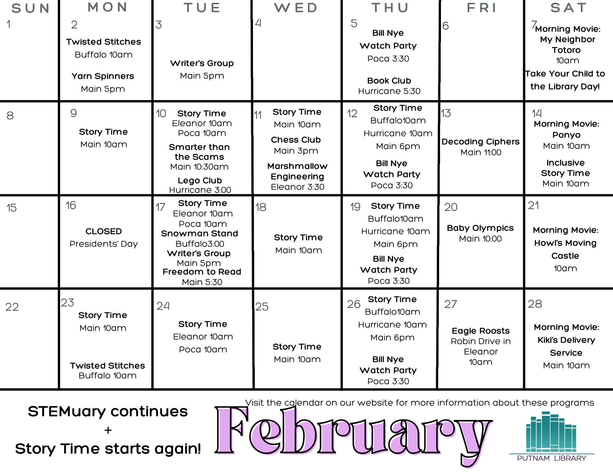 February might be the shortest month but as Love Your Library Month, there’s lots to love! Story Times resume on February 9, and STEMuary continues. Plus, a trip into nature at the end of the month to see bald eagles? What a lovely lineup!